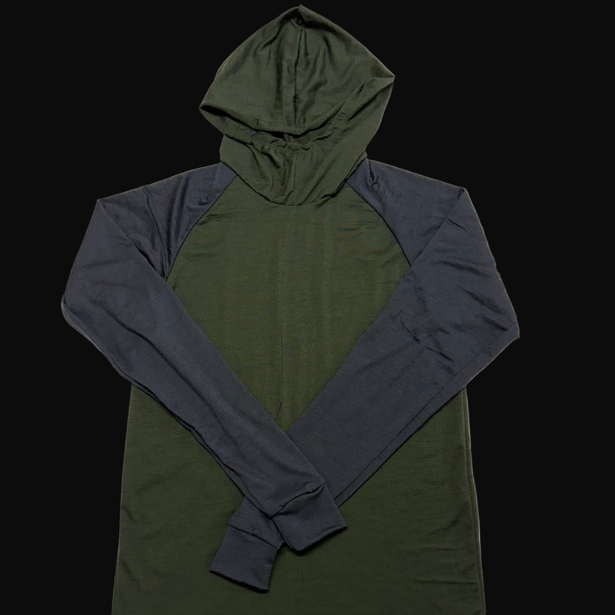 This is a lightweight 100% Merino that is the perfect layer for your next adventure. Fitted hood, with contrasting colors, and cuffs at the sleeves.